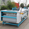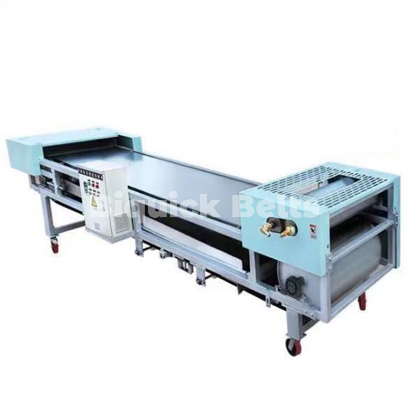 O resfriador de correia de aço inoxidável consiste em rolos duplos, transportador de correia de aço inoxidável, triturador de material em flocos, resfriamento por spray de água e mecanismo de rolamento. O material termofusível extrudado pela extrusora é enrolado em uma tira de 1-2 mm de espessura pelos rolos e resfriado com água. Durante o processo de transporte, água fria é pulverizada na parte traseira da correia de aço por meio de bicos, garantindo uma distribuição uniforme da água de resfriamento, o que permite que o material esfrie uniformemente até o estado sólido e se quebre em flocos que caem na tremonha de material. A água de resfriamento não entra em contato com as substâncias do sistema de refrigeração. A água de resfriamento não contaminada pode ser reciclada ou descartada sem causar poluição ambiental.